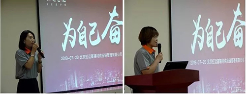 员工代表郝小红女士、耿俊芳女士相继讲话,, ,,,,,,她们体现,, ,,,,,,愿充分验展主人翁意识,, ,,,,,,从我做起、忘我拼搏,, ,,,,,,不扬弃、不放弃,, ,,,,,,坚定不移与虹运配合生长。。。。。。