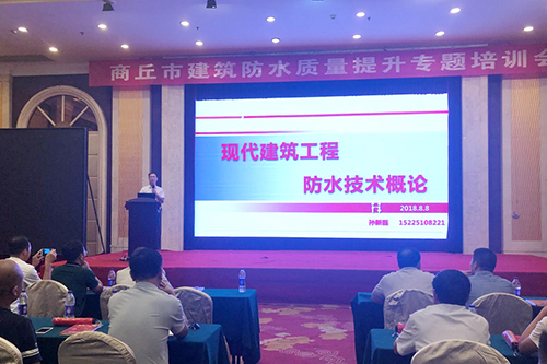 8月8日,,,,,,,,商丘市举行修建防水质量提升专题培训会。。。。。商丘市工程质量监视站站长张彦峰、东方优德88官网网站工渠事业部大郑州手艺副总工程师孙新磊出席聚会。。。。。来自商丘市各县区的质监站、建设、施工、监理、检测及有关单位认真人共300余人加入聚会。。。。。
