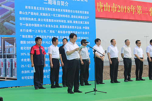 唐山东方优德88官网网站二厂、保温质料工厂建设总指挥马到原代表建设单位揭晓讲话,,,,,,,,他体现该项目引进美国R&D、意大利BOATO、德国SIEFER、西门子PLC等国际防水行业先进的工艺装备和智能化控制系统,,,,,,,,生产效率较行业平均水平高80%,,,,,,,,生产能耗降低30%以上;;;;;;;;应用自主研发的百余项焦点专利手艺,,,,,,,,研发出多种具有特殊物理性能、适候性强的高性能防水卷材;;;;;;;;同时,,,,,,,,节能环保,,,,,,,,以蠕动生物流化床环保系统处置惩罚污水,,,,,,,,以烟气燃烧手艺处置惩罚沥青烟气。。。。。。。。
