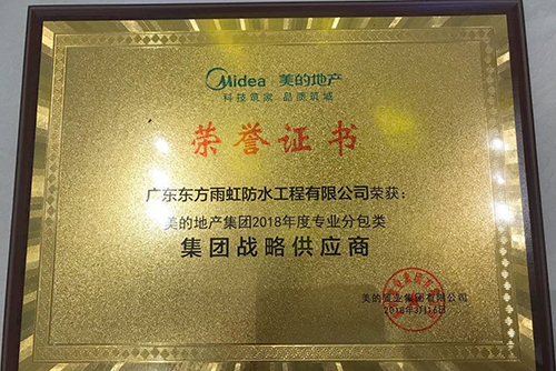 据悉,,,,,,,,在2012年,,,,,,,,双方企业基于对企业文化的相互认可,,,,,,,,以及对优质产品工程质量的配合追求,,,,,,,,签署恒久战略合作协议。。。。。。合作历程中,,,,,,,,东方优德88官网网站依赖优质的产品质料、紧跟修建结构的防水设计、实时的物流送货、完善到位的后续服务获得美的集团的高度信任。。。。。。本次获奖,,,,,,,,无疑是美的地产集团对东方优德88官网网站的优质产品和手艺服务的一连认可。。。。。。
