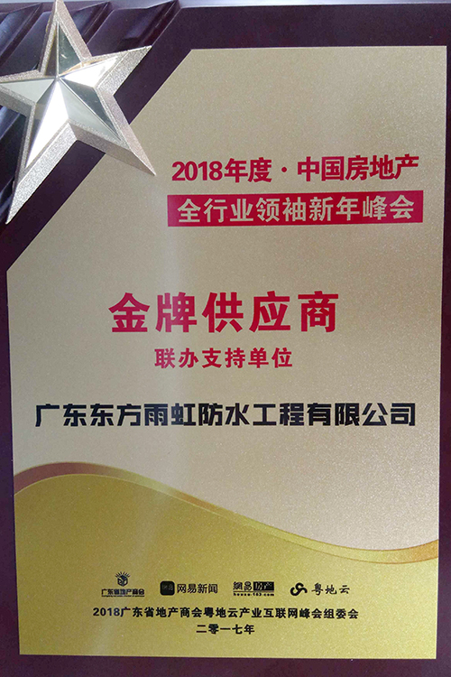 1月12日 ,,,,,,由广东省地产商会、网易房产团结主理的“2018中国房地产全行业首脑新年峰会暨中国地产冠军榜及粤地云工业互联网峰会”在广州南丰朗豪旅馆盛大举行 ,,,,,,约500多名政府部分职员、行业高层等出席本次聚会 ,,,,,,广东东方优德88官网网站总司理孙福琴应邀出席。。。。。。广东东方优德88官网网站防水工程有限公司荣获2018年度·中国房地产“金牌供应商”声誉称呼。。。。。。