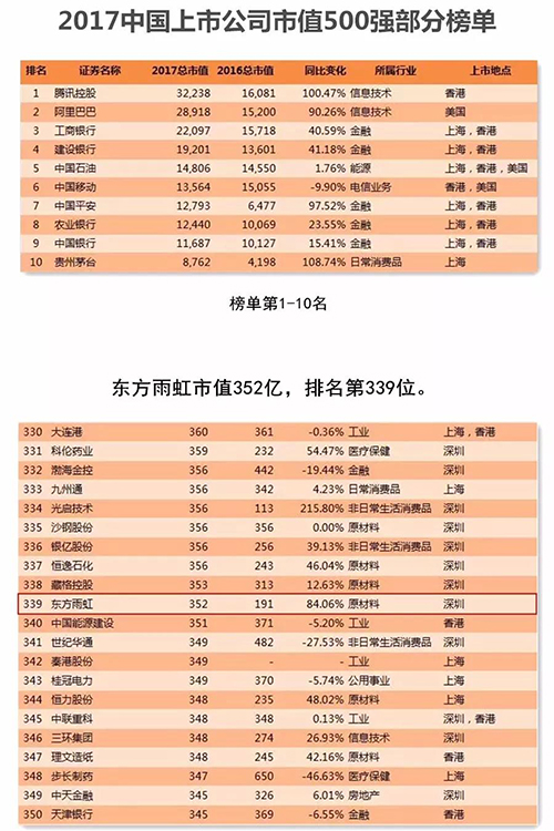 12月29日,,,,,东方财产Choice数据宣布2017年中国上市公司市值500强榜单。。。。。东方优德88官网网站以352亿市值名列第339位,,,,,较去年上升191位次。。。。。