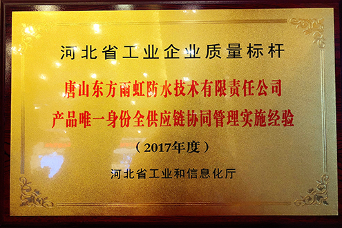 12月15日,,,,,,2017年河北省工业企业质量品牌建设履历交流会在石家庄召开。。。。。。。。河北省工业和信息化厅宣布2017年河北省质量标杆名单,,,,,,“唐山东方优德88官网网站防水手艺有限责任公司产品唯一身份全供应链协同管理实验履历”庆幸入选。。。。。。。。厂长马到原加入领奖并做现场汇报,,,,,,与参会各企业举行质量标杆典范履历交流。。。。。。。。