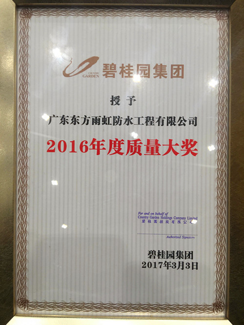 广东东方优德88官网网站荣获碧桂园集团“2016年度质量大奖”声誉称呼