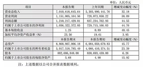 二、谋划业绩和财务状态情形说明   报告期内,,,,,公司实现营业总收入7,010,618,645.64元,,,,,较上年同期增添 32.18%,,,,,主要系随着公司品牌影响力一直提升,,,,,产品销量同比增添,,,,,质料销售业 务和施工服务营业规模均有所增添所致;;; ;;营业利润1,151,005,164.56元,,,,,较上年 同期增添58.09%,,,,,利润总额1,210,217,429.01元,,,,,较上年同期增添44.55%,,,,,归属 于上市公司股东的净利润1,056,322,372.85元,,,,,较上年同期增添44.76%,,,,,基本每 股收益1.25元,,,,,较上年同期增添40.45%,,,,,主要缘故原由是报告期公司营业状态整体向 好,,,,,主要产品的销售收入、施工收入继续增添,,,,,毛利润逐步提高所致。。 。。。 。 报 告 期 公 司 财 务 状 况 良 好 ,,,,, 截 止 2016 年 12 月 31 日 ,,,,, 公 司 总 资 产 8,868,807,006.18元,,,,,较本报告期初增添了45.77%,,,,,主要是公司谋划规模扩大所致。。 。。。 。