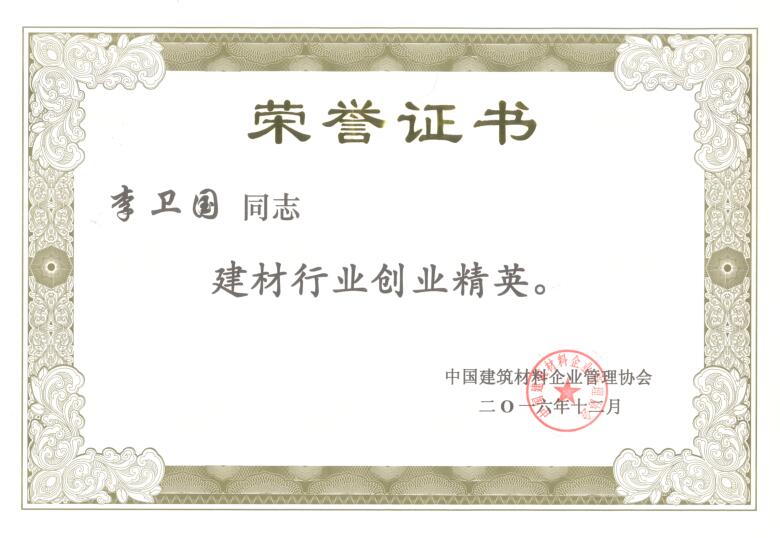 克日,,,,,,,“中国修建质料企业管理协会建设30周年座谈会暨2016年天下建材行业优异企业家宣布会”在北京乐成召开。。。。。。。东方优德88官网网站董事长李卫国荣获“建材行业创业精英”称呼。。。。。。。